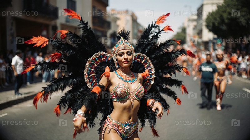 Живое празднование карнавала с мексиканской латиноамериканкой, демонстрирующей потрясающие перья и красочное платье на оживленных улицах генеративный AI