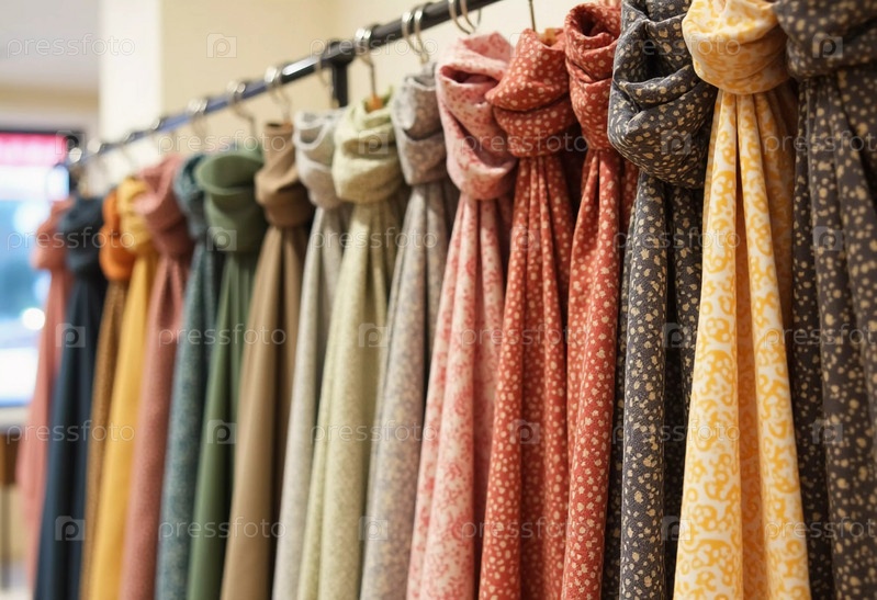 Сложно связанные занавесные узлы грациозно висят в текстильном магазине, демонстрируя яркий массив цветов, узоров и текстур при дневном свете