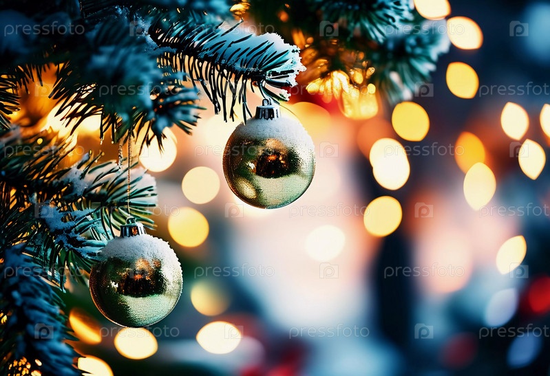 Красочные рождественские украшения украшают ветви пихты, яркие шары в оттенках синего, серебряного и золотого цветов воплощают праздничное настроение зимой
