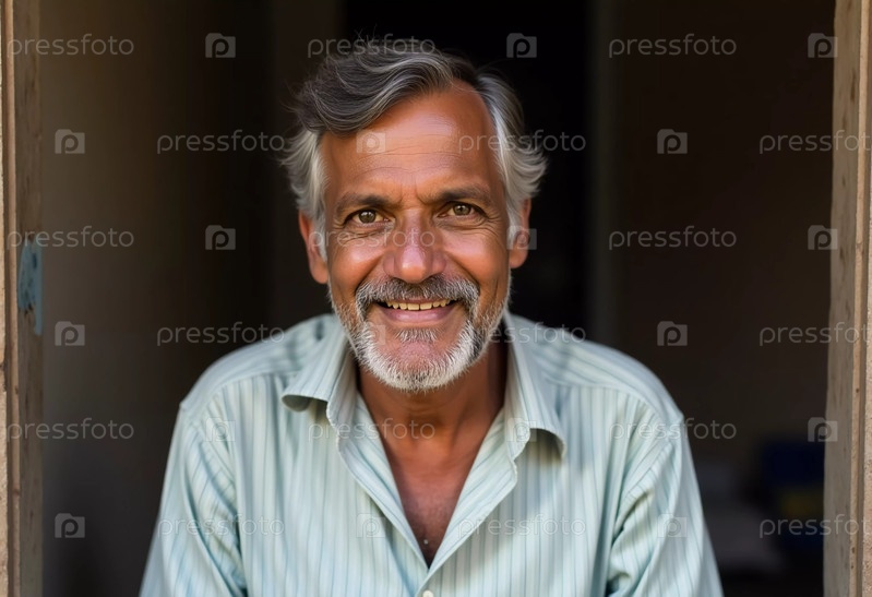 Веселый пожилой житель Индии делится искренней улыбкой, сидя у входа к своему уютному дому и излучая тепло и жизненный опыт солнечного дня