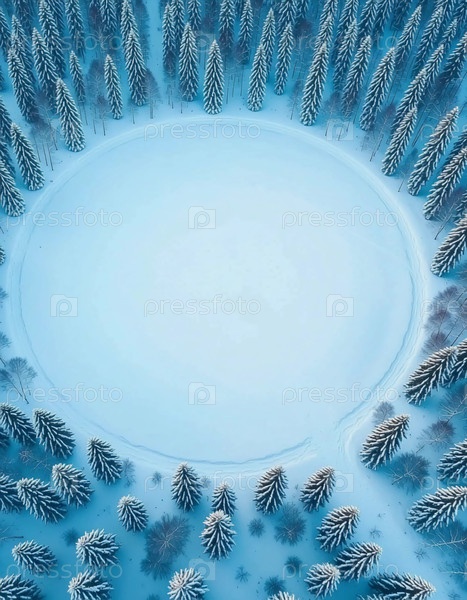Вид показывает большую круглую поляну, покрытую снегом и окруженную высокими вечнозелеными деревьями в зимнем пейзаже