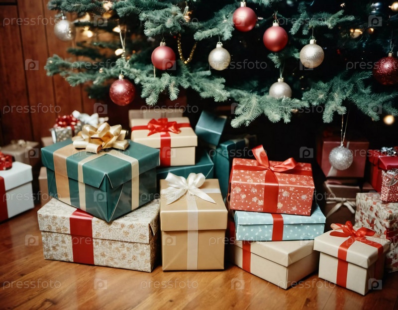 Празднично упакованные подарки в окружении красочных рождественских шаров под красиво украшенной пихтой во время радостного новогоднего сезона