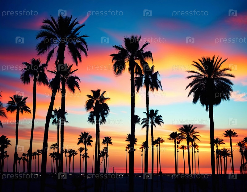 Когда заходит солнце, теплые оранжевые и розовые оттенки заполняют небо, излучая захватывающее блеск.Высокие пальмы стоят в силуэте, отмечая потрясающий цвет природы Генеративный ИИ