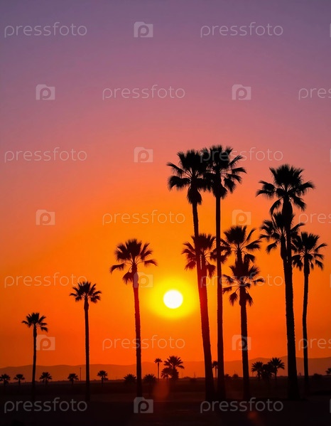 Силуетированные пальмы тянутся к захватывающему закат, поскольку небо превращается в холст из богатых апельсинов и глубоких фиолетовых