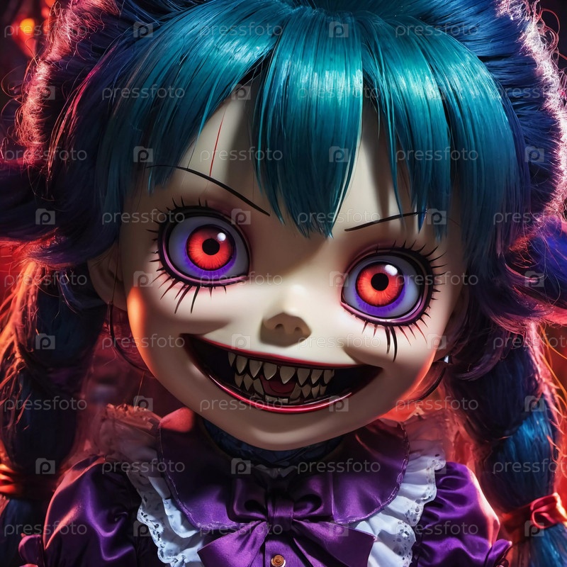 У зловещей куклы поразительные голубые волосы и тревожные глаза, она жутко улыбается при расположении на теневом фоне, создавая страшную атмосферу