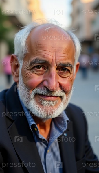 Пожилой человек с богатой белой бородой тепло взаимодействует со окружающим миром, демонстрируя свое радостное поведение на оживленных улицах Газы