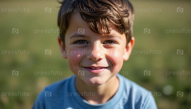 Молодой мальчик с запутавшимися коричневыми волосами сияет от радости на фоне яркой зелени, его светлые глаза отражают дух приключений и игривое любопытство