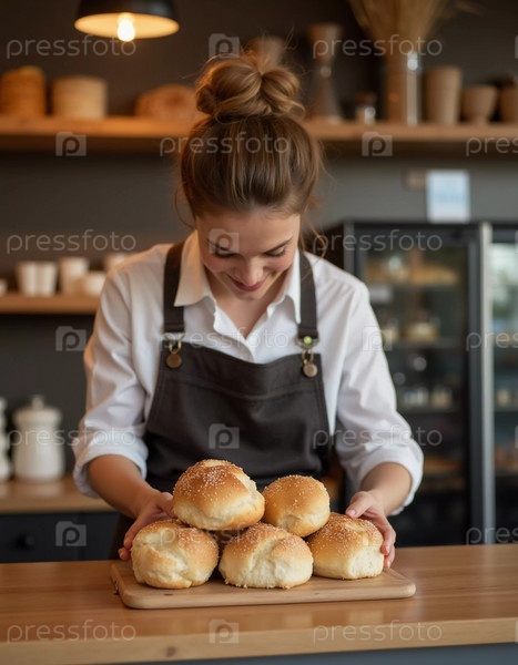 Улыбающийся пекарь держит теплый, хрустящий хлеб в очаровательной пекарне, наполненной различными продуктами для выпечки