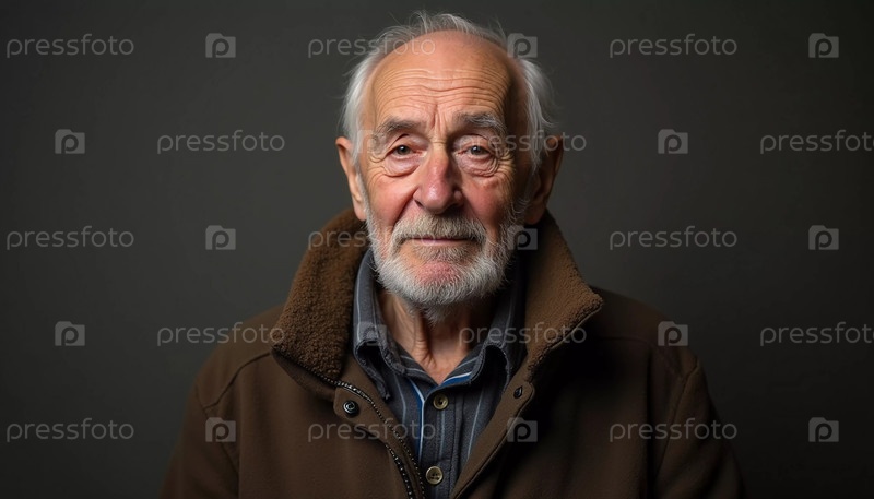 Пожилой мужчина уверенно стоит, одетый в черную куртку. Мягко освещенный фон. Портрет русского человека 60-70-80 лет. Серьезное, мудрое, продуманное лицо. Пенсионер с седыми волосами. Генеративная ИИ