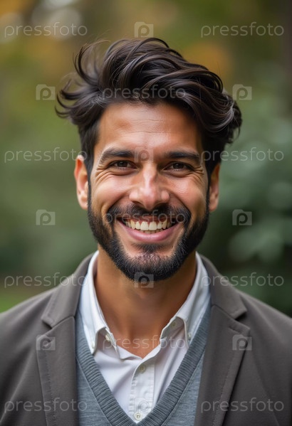 Веселый молодой симпатичный мужчина 30 лет, житель США, с короткими волосами и ухоженной бородой тепло улыбается в повседневной одежде. Мягкое освещение улучшает дружественную атмосферу