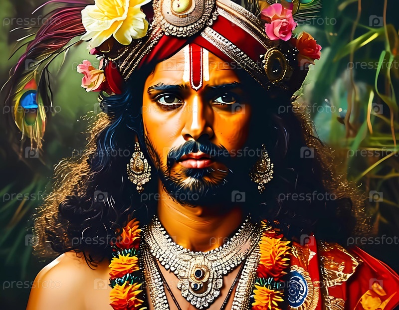 Господь Кришна, украшенный яркими цветами и сложными драгоценностями, грациозно стоит в окружении пышной зелени, воплощая любовь, сострадание и мудрость во время священного празднования Generative AI
