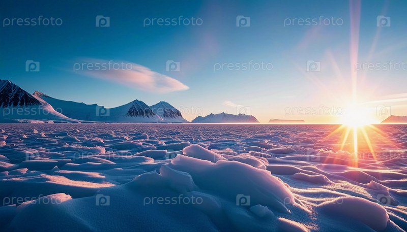 Спокойный арктический ландшафт тундры покрыт морозом при восходе солнца, излучая золотистый свет над ледяной местностью и освещая тонкие образования льда