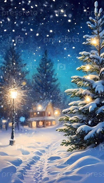В спокойную снежную ночь мягкие боке-рождественские огни украшают еловые ветви среди живописного пейзажа. Видны уютные дома, излучающие тепло и празднование в стране зимних чудес