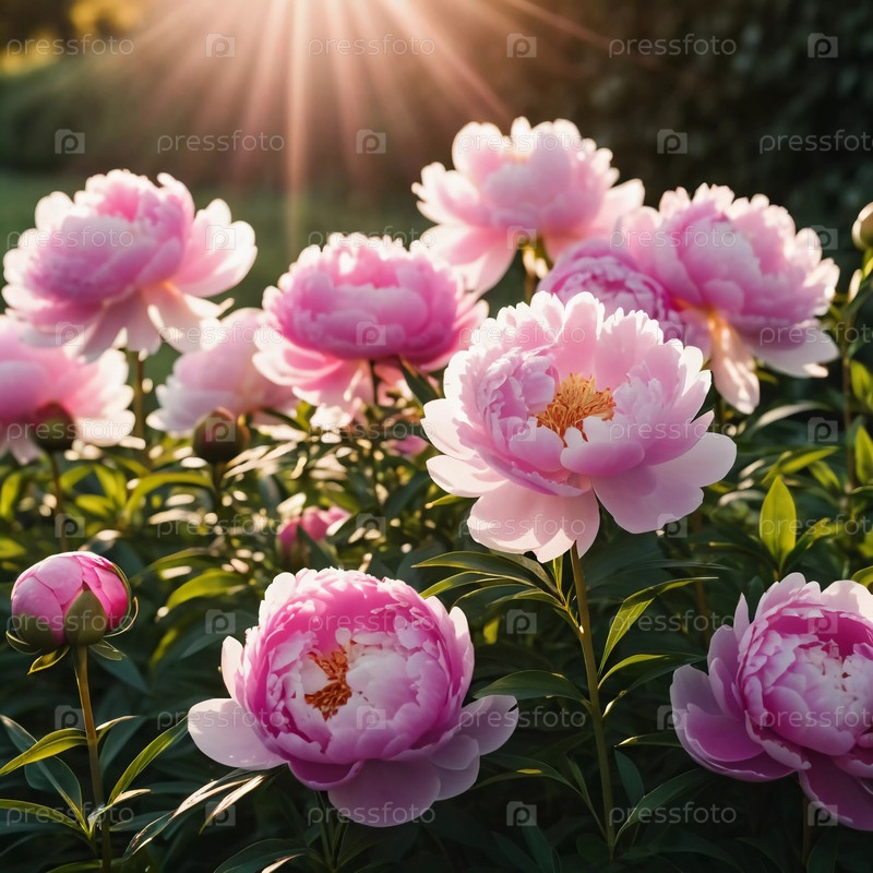 Живые цветы пионки в розовых оттенках стоят высоко, когда на заднем плане заходит золотое солнце, создавая спокойный и атмосферный пейзаж, наполненный теплом