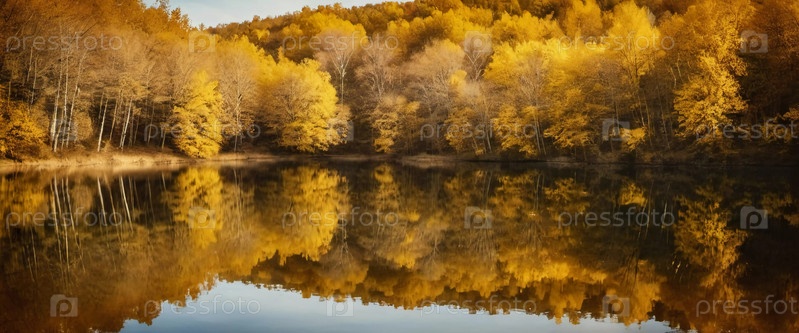 Вибрирующие желтые листья создают потрясающий осенний дисплей вокруг спокойного озера с отражениями, отражающими листву на поверхности воды по мере того как день подходит к концу