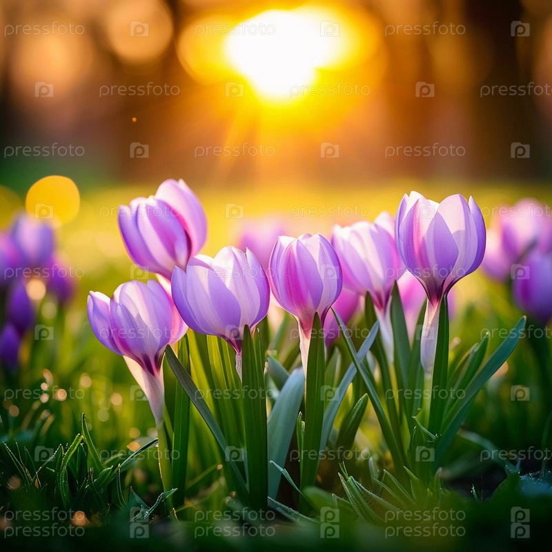 Нежные розовые цветы крокуса расцветают в пышной зеленой траве, солнечный свет в тихой весенней обстановке. Возрождение природы. Шафран Крокус - род многолетних луковичных травных растений семейства Ирис Iridaceae