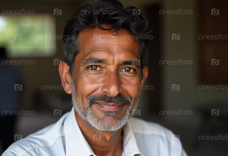 Мужчина средних лет из Индии сияет теплотой, демонстрируя свое дружелюбное поведение на фоне мягко освещенного фона