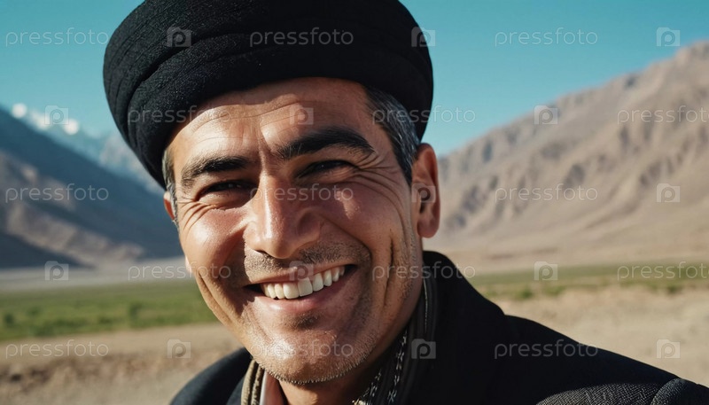 Веселый 45-летний таджикский мужчина в традиционной одежде с яркой улыбкой на потрясающем фоне, излучающий тепло и счастье