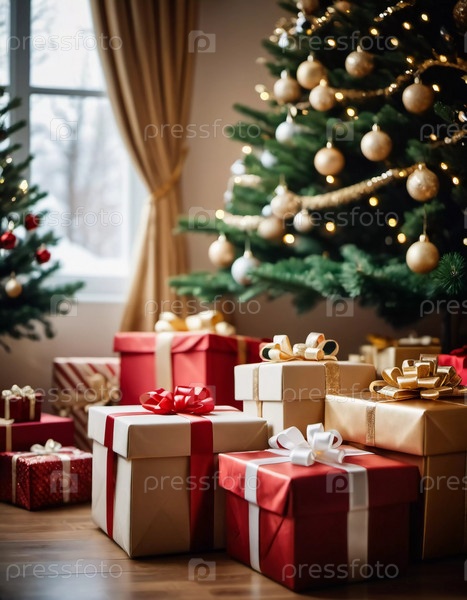 Празднично упакованные подарки в окружении красочных рождественских шаров под красиво украшенной пихтой во время радостного новогоднего сезона