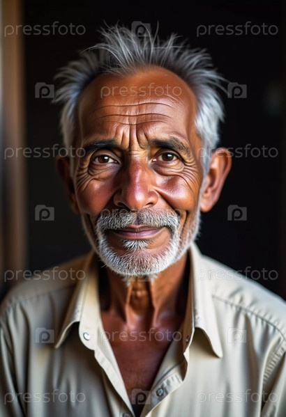 Пожилой человек из Индии тепло сидит в своем доме, нежная улыбка подчеркивает линии его лица, которые рассказывают истории о длительной и богатой жизни