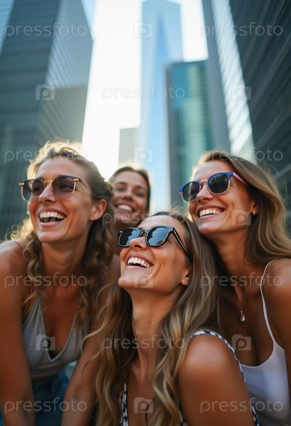 Четверо друзей делятся радостными моментами, наполненными смехом, когда они собираются возле небоскреба.Живая энергия города усиливает их связь в этой живописной городской обстановке