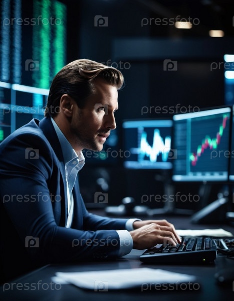 Трейдер, ориентированный на цифровой финансовый анализ сидит за компьютером в элегантном торговом зале, заполненном экранами, отображающими рыночные тенденции и данные