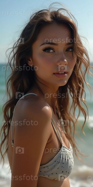 Брюнетка в купальнике смотрит назад, стоя возле береговой линии. Нежные морские волны обнимают ее у ног под чистым голубым небом. Длинные волосы, красивое молодое лицо. Путешествия и реклама одежды