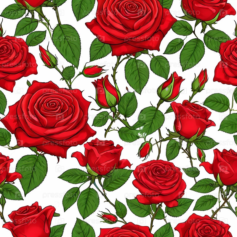 В живописном саду среди пышных зеленых листьев цветут обильные красные розы, их бархатные лепестки приглашают к восхищению и вызывают чувство романтики и радости