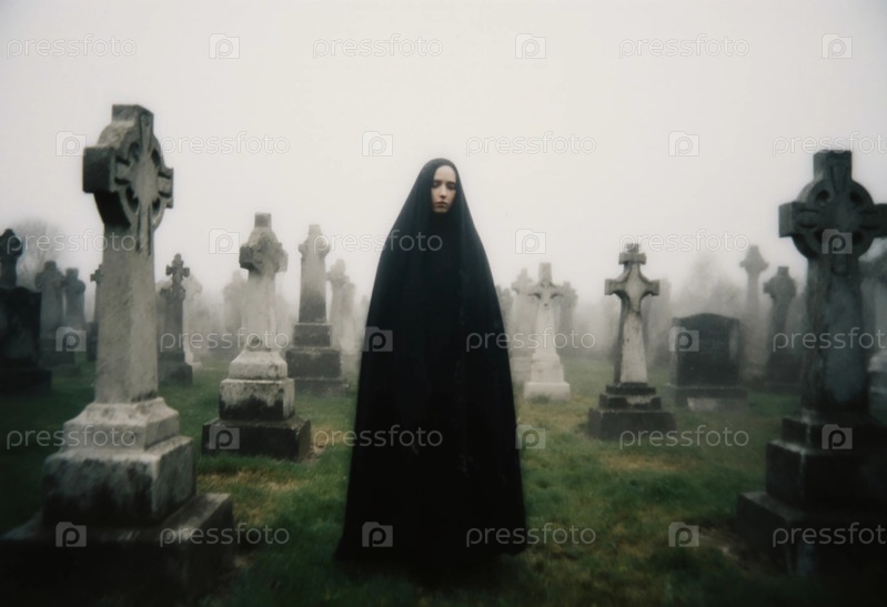 Фигура, одетая в черное, появляется на завуалированном туманом кладбище, окруженном надгробными камнями.Атмосфера жуткая, намекающая на присутствие духов и неизвестного генеративного ИИ
