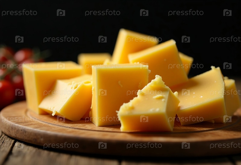 Живое расположение кубиков сыра-чеддера лежит на круговой деревянной доске, в сопровождении сверкающих вишневых помидоров, создавая теплое и приглашающее ощущение идеально подходит для собраний