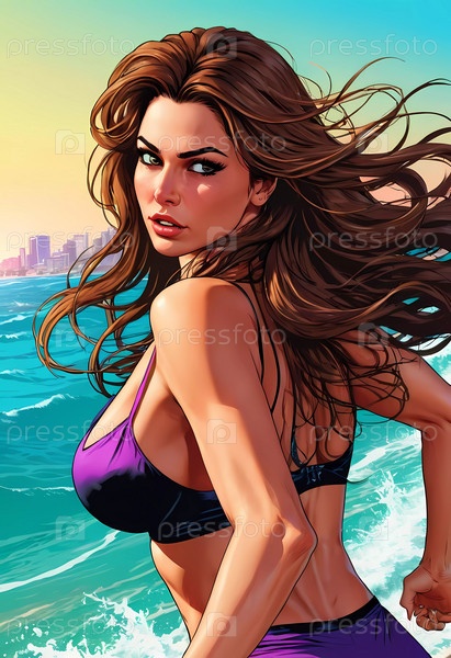 Женщина наслаждается оживленным днем на пляже, бегая вдоль береговой линии в купальнике, ее длинные волосы свободно текут в океаническом бризе, а волны мягко обнимают ее ноги