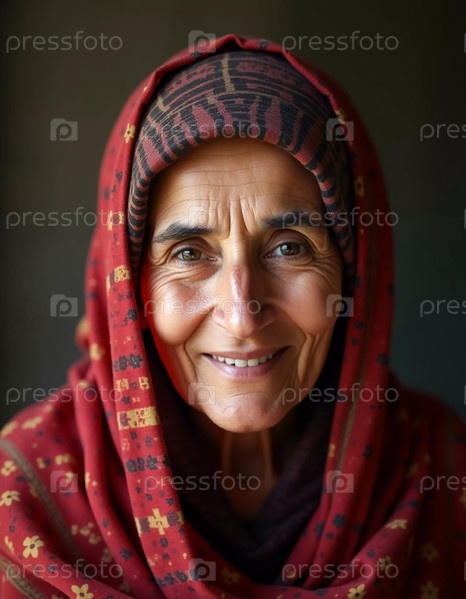 Эта пожилая йеменская женщина, украшенная ярко-красными платками на голове, делится сердечной улыбкой, которая отражает ее богатую культуру и жизненные переживания