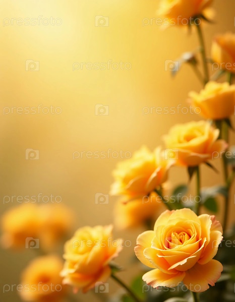Нежные желтые розы цветут ярко, создавая захватывающее отображение тепла и красоты. На фоне блестящего боке-фонда, который блистает мягкими золотыми оттенками. Чувство магии. Пустое пространство. AI