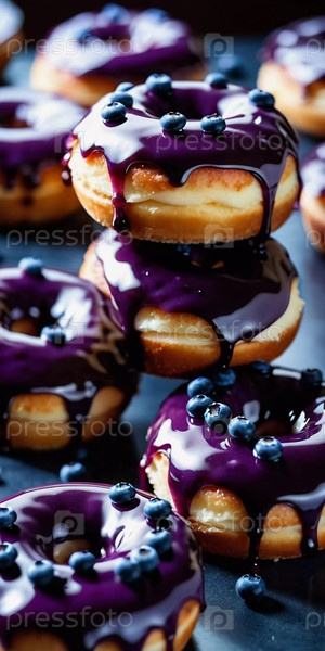 Соблазнительная куча свежеприготовленных голубиных филевых пончиков с богатой глазурью, демонстрирующих яркие ягоды сверху, идеально подходит для желания десерта в любое время суток