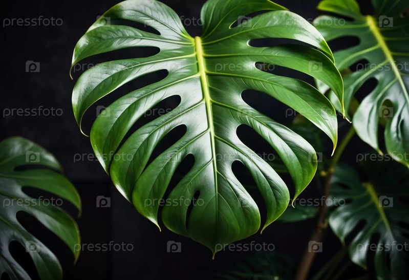 Большие, яркие листья монстеры демонстрируют свои знаковые разделенные формы, привлекая внимание в спокойной помещенной обстановке, освещаемой мягким солнечным светом, фильтрующим через генеративный ИИ