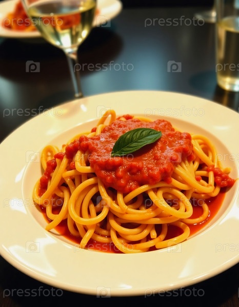Щедрые порции спагетти, покрытые ярким томатным соусом и нежными листьями базилика.Теплая гостеприимная атмосфера дополняет богатый аромат блюда Generative AI