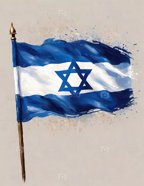 Рисунок израильского флага. Машущий на ветре, с синими и белыми полосами и звездой Давида в центре. Эффекты брызги вокруг флага, создающие ощущение движения и энергии. ИИ генерируется