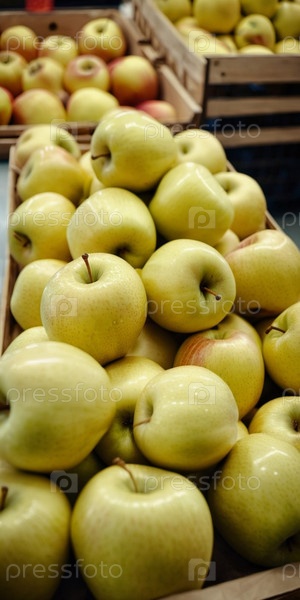 Красочный ассортимент желтых яблок аккуратно расположен на стойке супермаркета, приглашая клиентов исследовать и выбирать свежие фрукты