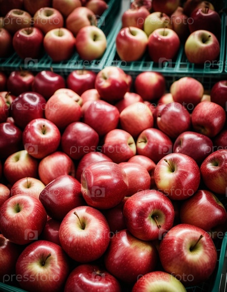 Красочный ассортимент красных яблок аккуратно расположен на прилавке супермаркета, приглашая клиентов исследовать и выбрать свежие фрукты
