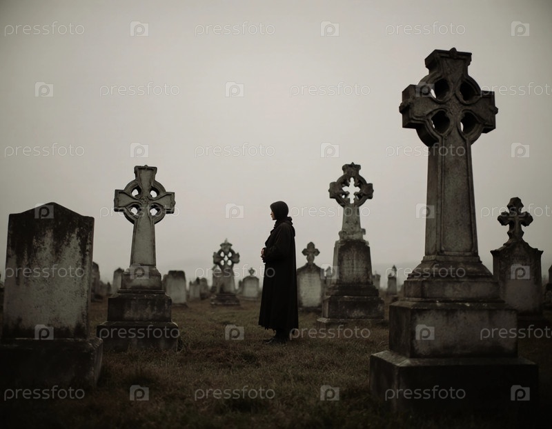 В ночь Хэллоуина одинокая фигура в темном плаще ходит среди древних надгробных камней на старом кладбище, окутанное туманом и тайной