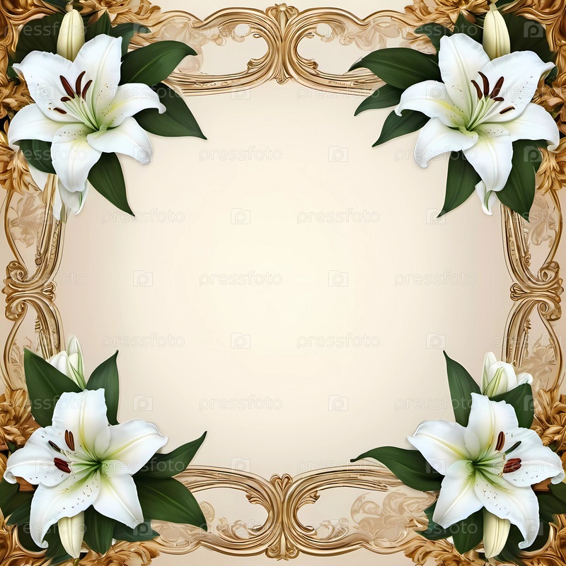 Декоративная рама, украшенная белыми лилиями и зелеными листьями, окружает мягкий бежевый фон, идеально подходящий для добавления персонализированного оттенка к приглашениям или объявлениям