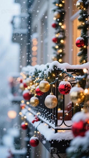 Ярко-красные и золотые рождественские шары висят с заснеженного балкона, мерцая от мягких огней в то время как снежинки нежно падают, создавая спокойную зимнюю сцену Generative AI
