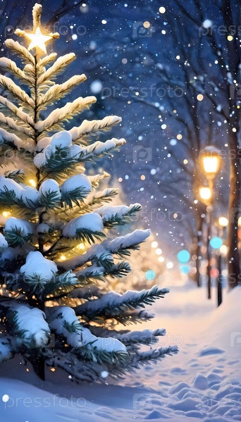 В спокойную снежную ночь мягкие боке-рождественские огни украшают еловые ветви среди живописного пейзажа. Видны уютные дома, излучающие тепло и празднование в стране зимних чудес