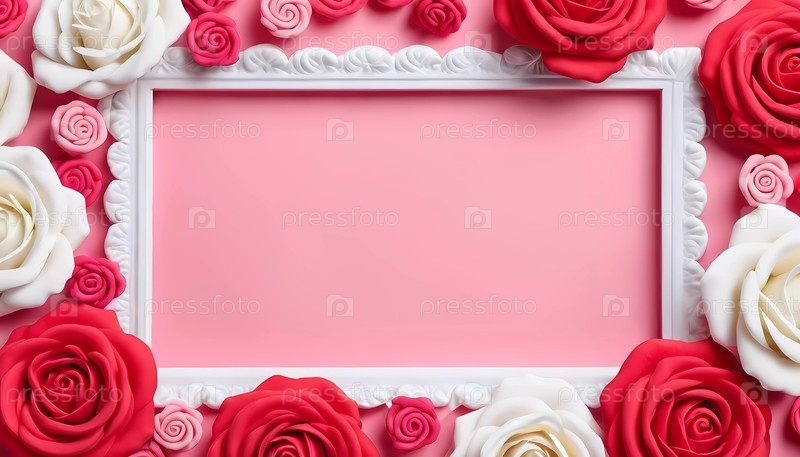 Яркая рама, украшенная красными, розовыми и белыми розами, установлена на мягком розовом фоне, обеспечивая идеальное пространство для личных сообщений или драгоценных воспоминаний