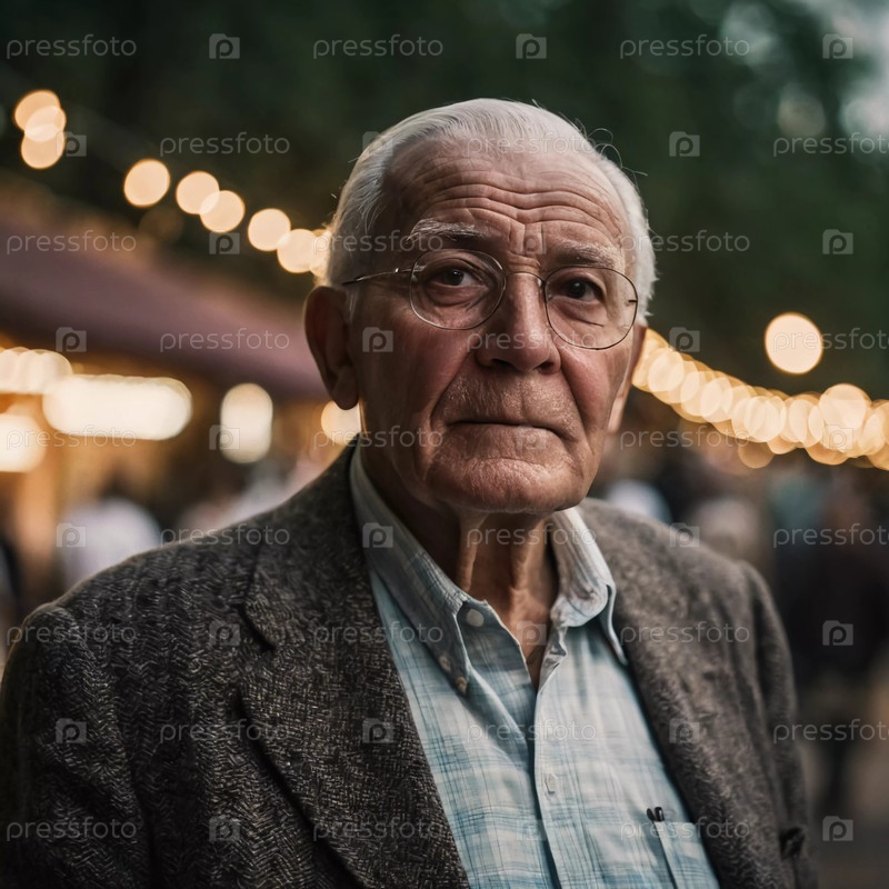 Пожилой мужчина в очках стоит тихо, окруженный мягкими светящимися огнями на оживленном вечернем рынке.Он размышляет над воспоминаниями, а другие наслаждаются праздником поблизости