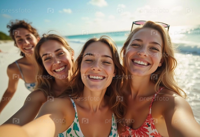 Друзья наслаждаются солнечным днем на пляже, улыбаясь и смеясь во время совместного запечатления веселого момента. Голубое небо дополняет их радостный дух и летнюю атмосферу. Белый песок. Генеративная ИИ