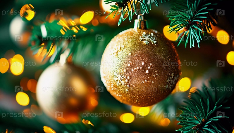 Блестящие орнаментные шары из яркого золота висят на ветке пышной ель. Мягкие, теплые огни мерцают, улучшая праздничный дух Рождества. С Новым годом. Анаморфический бокех. Генеративный ИИ