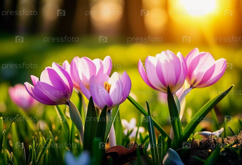 Нежные розовые цветы крокуса расцветают в пышной зеленой траве, солнечный свет в тихой весенней обстановке. Возрождение природы. Шафран Крокус - род многолетних луковичных травных растений семейства Ирис Iridaceae