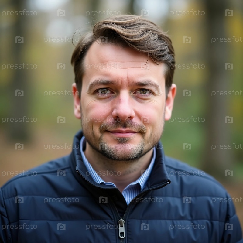 Под навесом осенних листьев стоит белорусский мужчина, излучающий уверенность и спокойствие.Его спокойное поведение отражает глубокую связь с мирным окружением