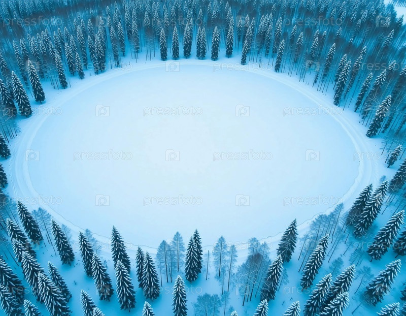 В лесу видна круглая зона снега. высокие деревья окружают эту равнину под чистым зимним небом. земля покрыта толстым слоем снега Generative AI